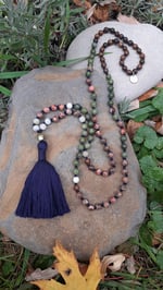 This lovely Mala is carefuly made of Sandalwood, Amazonite, Green Canadian Jade, Leopard Jasper beads and RainForest Jasper as a teacher bead .